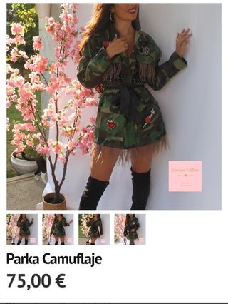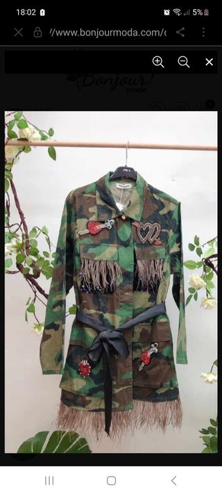 Preciosa chaqueta con estampado de camuflaje y parches de piedras.Plumas y lentejuelas en los bolsillos y bajo.Está sin estrenar.Precio original como se ve en la 1° foto 75€.Talla S/M