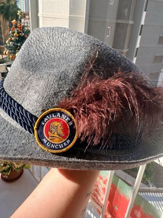 Sombrero de fieltro gris con un toque distintivo. - Adornado con una cuerda azul. - Detalle de pluma y pin. - Pin con diseño de Paulaner München.