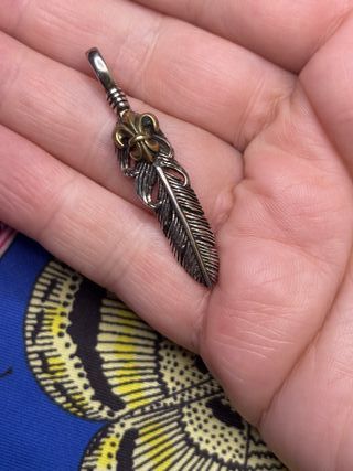 Colgante con diseño de pluma y flor de lys. - Detalle de flor de lys en tono dorado. - Diseño de pluma con acabado plateado.