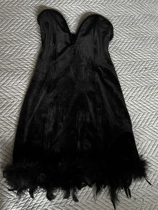 Vestido de terciopelo con un toque elegante de plumas en el bajo. - Material: Terciopelo. - Detalle: Plumas en el dobladillo.