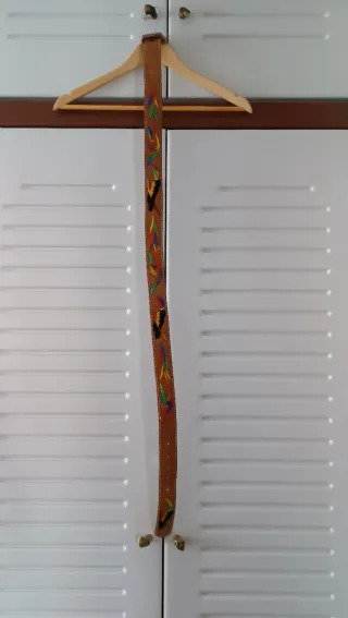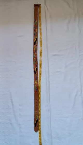 Cinturón de cuero con un diseño de plumas bordadas en colores vivos. Apenas usado y en excelente estado. - Diseño de plumas bordadas. - Material de cuero.