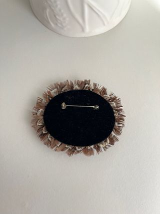 Precioso broche artesanal con un diseño inspirado en la naturaleza. - Elaborado con plumas naturales. - Detalle central de piedra ovalada. - Adornado con pequeñas cuentas y piedras claras.