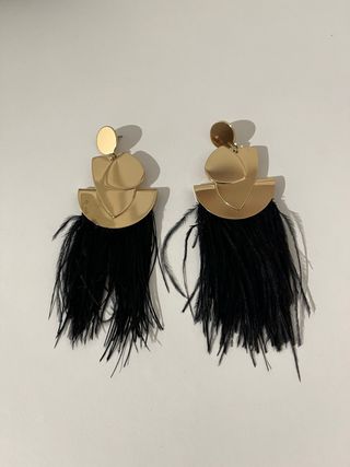 Elegantes pendientes con un diseño moderno y llamativo. - Detalle de plumas negras. - Acabado metálico dorado.