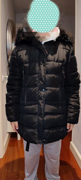 Abrigo de plumas negro de la marca Boomerang, con capucha. - Diseño acolchado. - Capucha con pelo sintético. - Cierre de cremallera y corchetes - Cordones ajustables en la cintura. Interior 50% Pluma y 50% de Plumón buen estado