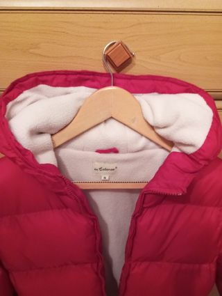 Esta nueva, del año pasado. Me han regalado en Navidad otra parecida. Es un color rojo coral muy chulo, tal cual sale en las fotos. Relleno sintético, no pluma/plumón.