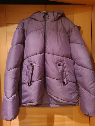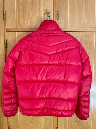 Abrigo tipo cazadora acolchada con relleno de plumas. Diseño moderno y cálido. Poco uso - Cierre de cremallera frontal. - Bolsillos laterales con cremallera. - Cuello alto.