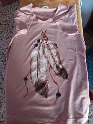 Dos bonitas blusas para embarazadas, ideales para cualquier ocasión. Una de manga larga con estampado de plumas en tonos grises y rosas sobre fondo negro, y otra de manga larga de color rosa, con textura de lunares. Ambas están en perfecto estado y listas para lucir.