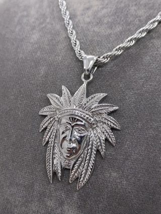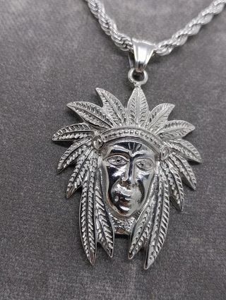 Preciosa pieza de acero quirúrgico. Un colgante con diseño de jefe indio, muy bien conservado. - Material: Acero quirúrgico. - Diseño: Jefe indio con tocado de plumas. - Ideal para regalar o para uso personal. - Incluye cordón rizado.