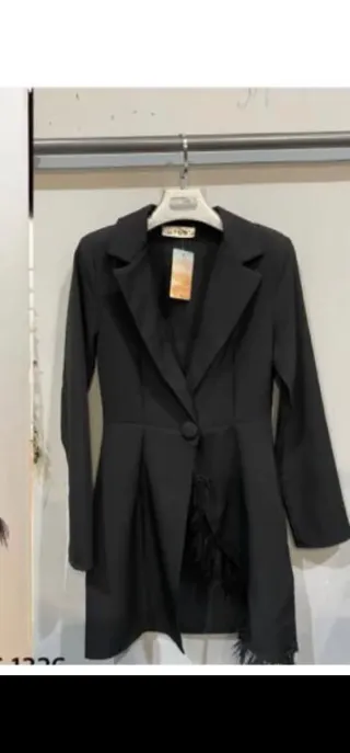 Elegante vestido negro con un diseño moderno. - Detalle de plumas en el bajo. - Corte entallado. - Cierre de botón.