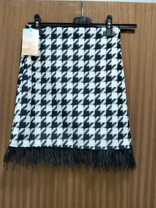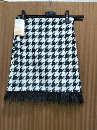 Falda con estampado clásico de pata de gallo y detalle de plumas en el bajo. - Diseño de pata de gallo en blanco y negro. - Adorno de plumas negras en el dobladillo.