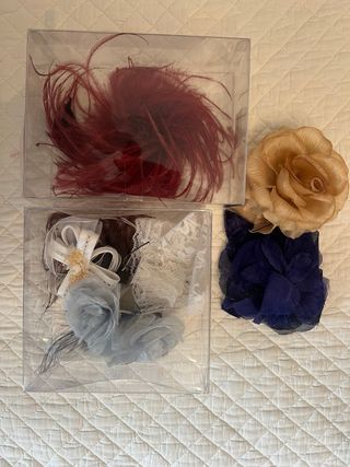 Precioso tocado para el cabello con forma de flores y detalles de perlas. - Diseño delicado con flores de tela y plumas. - Adornado con pequeñas perlas. - Montado sobre horquilla metálica. - Medida total 17 CMS