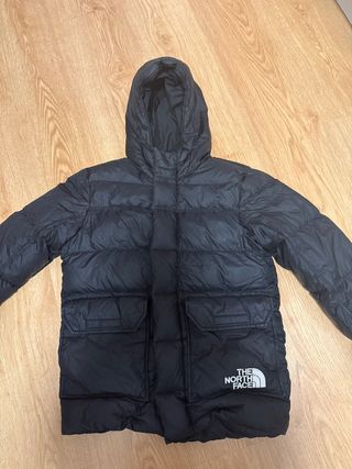 Abrigo acolchado de plumas The North Face en color negro. Presenta un diseño moderno y funcional, precio original 300€ apartado adolescentes equivalente a una XS. - Capucha integrada. - Bolsillos frontales con solapa. - Logo de la marca en la parte inferior y delantera.