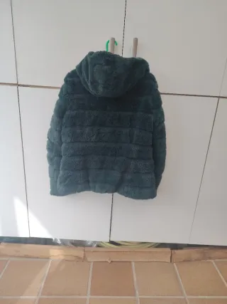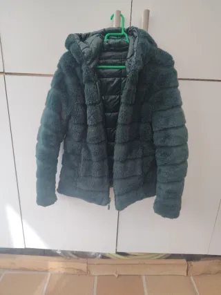 Cazadora acolchada de plumas con capucha de pelo sintético. - Diseño a rayas horizontales. - Bolsillos frontales con cremallera. - Cierre central con cremallera. - Varios bolsillos interiores. - Color verde pistacho. - Unisex. - Queda muy bien puesto y abriga mucho, ideal para la nieve. - Talla S/M. - Relleno de plumas. - Vendo por falta de espacio en el armario. - Precio algo negociable.