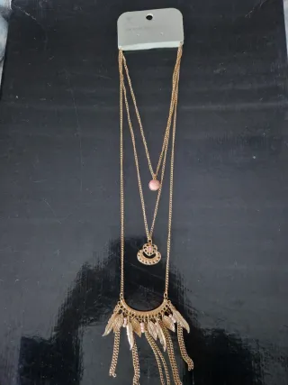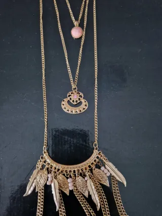 Collar largo con varios colgantes y detalles. - Diseño de varias cadenas superpuestas. - Colgantes con forma de plumas y cuentas. - Detalle central con piedra rosa. - Acabado en tono dorado.