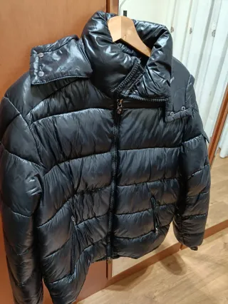 Plumas negro con brillo de hombre es una Xl . Plumas para la nieve. Muy buenos acabados no pesa nada. Plumón auténtico. Capucha desmontable. Auténtico comprado en tienda Armani. NO FALSO.