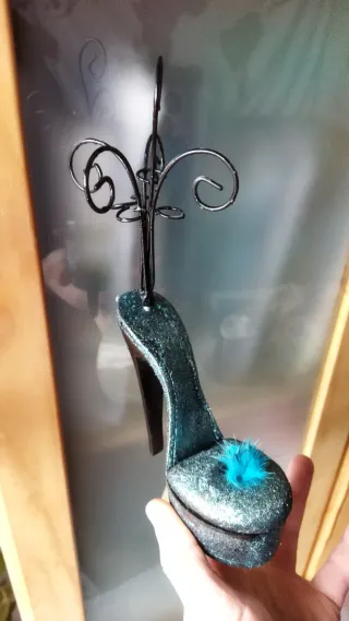 Original joyero con forma de zapato de tacón alto, decorado con purpurina. - Diseño de zapato de tacón. - Acabado brillante con purpurina. - Adorno de plumas. Con cajita y con varios ganchos para pendientes, pulseras...