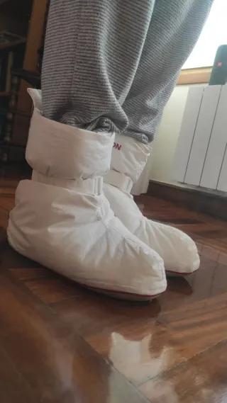 Patucos de plumas TempraKON en color blanco. Son muy cómodos y cálidos. - Material exterior algodón - Suela flexible y antideslizante - Cinturón ajustable al tobillo - Talla 38-44 aprox