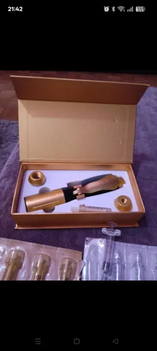 Pluma estética con un diseño elegante en tono dorado y negro. Incluye accesorios para su uso. Para rellenar labios y arrugas - Accesorios de aplicación.