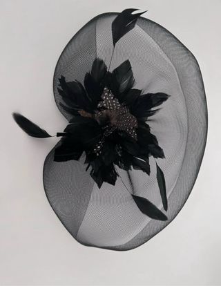 Elegante tocado negro, perfecto para eventos especiales. Diseñado con una base de malla y adornado con plumas. - Base de malla fina. - Detalle de plumas negras. - Adorno de plumas con puntos.