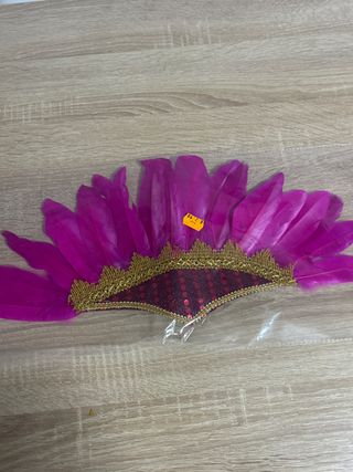 Diadema de plumas moradas y doradas