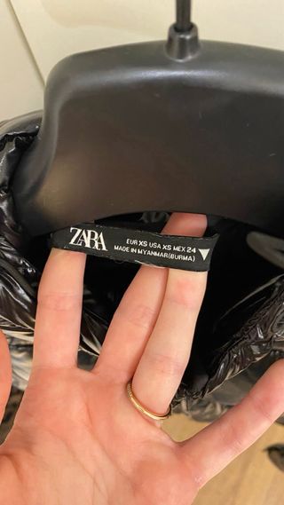 Abrigo de plumas negro de Zara para mujer. Es una prenda cálida y estilosa. - Diseño acolchado. - Capucha. - Cierre de cremallera.
