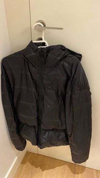 Chaqueta de plumas con un acabado brillante y un diseño acolchado. - Poco uso. - Cierre de cremallera frontal. - Capucha integrada.