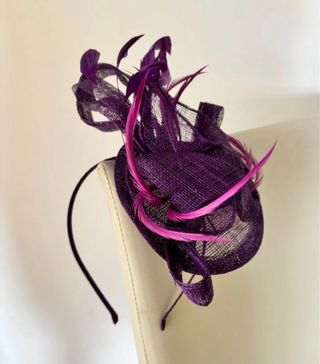 Elegante tocado para eventos especiales. - Diseño con plumas y tela. - Color morado vibrante.