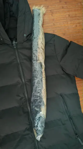 Chaqueta con relleno plumas y plumón, combina el acolchado de plumas con tejido neopreno muy flexible lo que lo hace un abrigos muy caliente y cómodo, en su interior y en la capucha lleva pelo para mayor calidez Color negro, cremallera en los bolsillos Está usada, pero aún sigue en buen estado