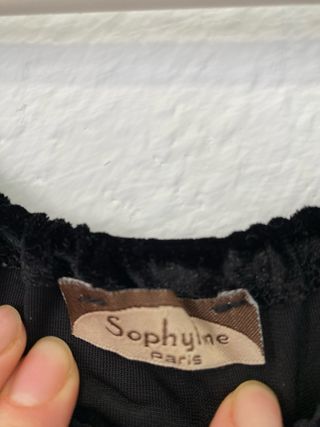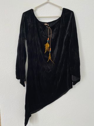 Blusa de terciopelo negro con un diseño asimétrico y un toque bohemio. - Detalle de cordón con cuentas y plumas. - Mangas largas. - Corte original y favorecedor. Estilo: Y2K • Color: Negro • Marca: Sophyline Paris • Talla: Única • Material: Poliéster y elastano Medidas: • Hombros: 43 cm • Pecho: 45 cm • Largo: 70 cm • Mangas: 56 cm