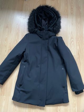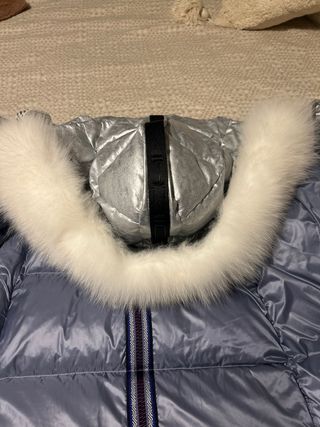 Plumifero de esquí acolchada con detalles en contraste. Cuenta con un diseño moderno y funcional. - Capucha con ribete de pelo sintético. - Cremallera frontal completa. - Bolsillos con cremallera en los laterales y en la manga. Confeccionado pluma y plumon . Usado para esquiar , presenta algunas manchas de roce que se muestran .