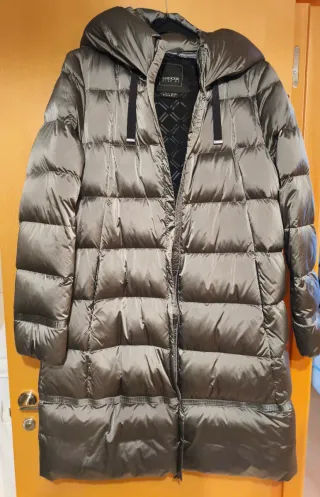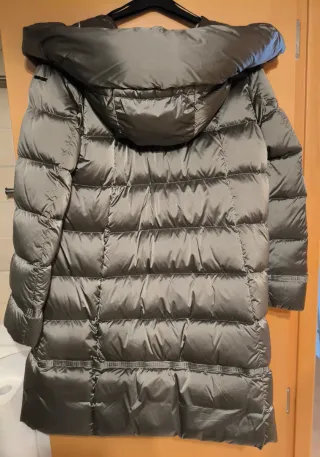 Abrigo largo de plumífero con capucha. Color - plateado Ligero, eco Fiendly. Respira. Talla XL italiana , perfectamente adapta a 40/42/44. - Diseño acolchado. - Cierre de cremallera frontal. - Bolsillos laterales.