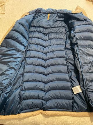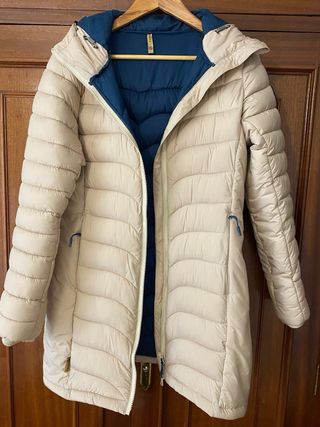 Plumífero largo de la marca Ternua. - Color beige y azul. - Talla M. -pvp 250€ -Medidas en las fotos