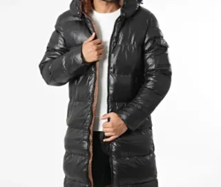 Plumífero acolchado con acabado brillante. - Diseño moderno con cuello alto. - Cierre de cremallera. - Bolsillos laterales con cremallera. - Capucha integrada.