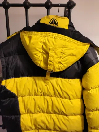 Plumífero con un diseño moderno y llamativo. - Combinación de colores negro y amarillo. - Capucha integrada. - Cierre con cremallera y correa ajustable.