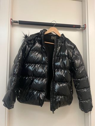 Plumífero brillante con capucha. - Diseño acolchado. - Cierre de cremallera. - Detalle de pelo en la capucha.