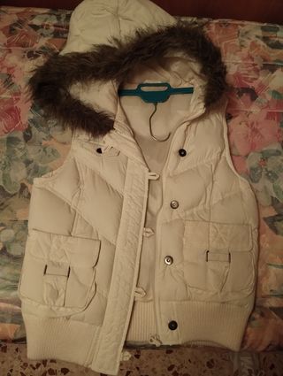 Chaleco blanco plumífero con pelo en la capucha. Ancho 46cm y largo 58cm.