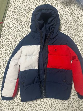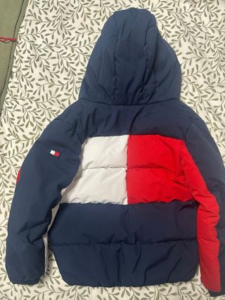 Abrigo plumífero de la marca Tommy Hilfiger en talla 116. Presenta un diseño tricolor con paneles en azul marino, blanco y rojo. - Cierre de cremallera. - Capucha integrada. - Bolsillos laterales.