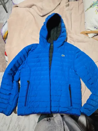 Plumífero con capucha de la marca Lacoste. - Color exterior azul. - Color interior verde. - Logo de Lacoste en el pecho.