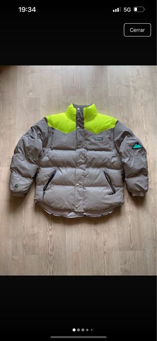 Abrigo plumífero de la marca Grimey con un diseño moderno y llamativo. - Combinación de colores gris y verde lima. - Cuello alto. - Bolsillos frontales con cremallera.