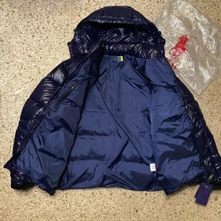 Chaqueta plumífero Ralph Lauren de color azul marino con acabado brillante. Cuenta con capucha y cierre de cremallera. - Logo de Ralph Lauren bordado en el pecho. - Bolsillos frontales con cremallera. - Puños elásticos.