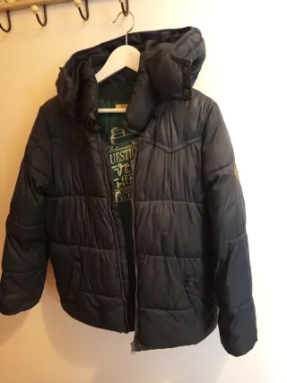 Plumífero juvenil de color azul marino, perfecto para el frío. Marca Brotes, del corte inglés. Talla 14. - Diseño acolchado. - Capucha integrada. - Cierre de cremallera frontal. - Bolsillos laterales.