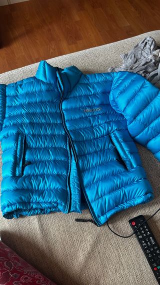 Plumífero acolchado de la marca Marmot en color azul. Es ligero y perfecto para el frío. - Cierre de cremallera. - Bolsillos laterales con cremallera. - Bolsillo interno. Tiene una de las gomas abajo estropeada, pero no se ve.