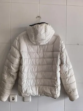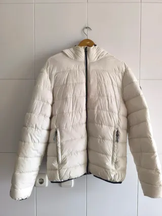 Plumífero ligero y acolchado Ecoalf original - Diseño con capucha. - Cremallera frontal. - Bolsillos laterales con cremallera. - Detalle de logo en la manga -Color blanco -Talla M -Longitud standard -2 Bolsillos interiores -Cierre cremallera -Color del interior beige -Detalle de logo en manga