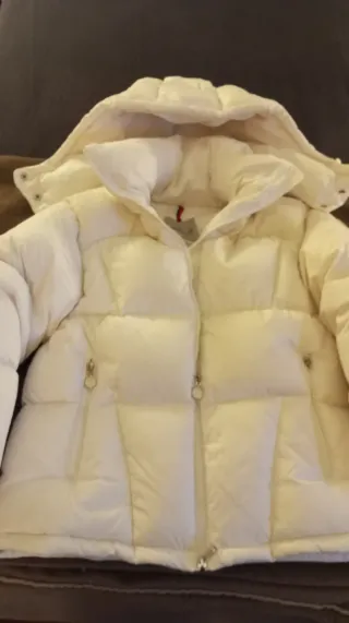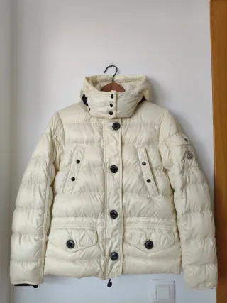 Yo tengo una talla M (40) y tengo bastante pecho, y me queda entallado, pero me cierra bien y me va. Lo vendo por limpieza de armario; está en perfectas condiciones, con todos los botones, etiquetas de calidad. Puede probarse y verse sin compromiso. Chaqueta acolchada de la marca Moncler en color beige. Diseño moderno y cálido. La capucha puede quitarse fácilmente. - Cierre de cremallera y botones. - Bolsillos frontales en el pecho e inferiores con solapa y abotonados.