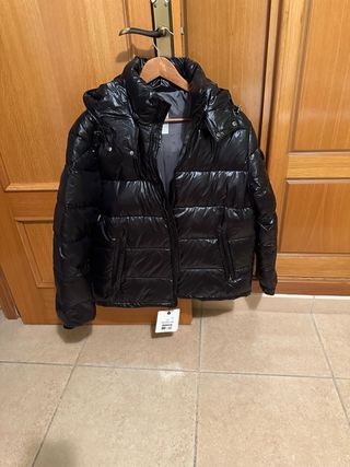 Plumífero negro con acabado brillante, estilo Moncler. Se encuentra en perfecto estado, como nuevo. - Diseño acolchado. - Capucha integrada. - Cremallera frontal. - Bolsillos laterales con cremallera.