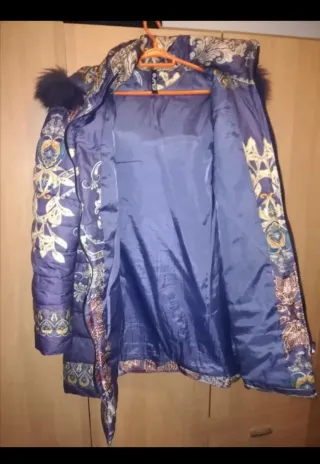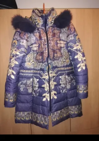 Abrigo acolchado con capucha y reversible. - Diseño acolchado reversible con plumas y pelo sintético. - Cierre de cremallera. - Bolsillos laterales con cremallera.uno de los bolsillos aparece roto en la foto pero no impide su uso. -proporciona cobertura adicional contra el frío. Preguntar medidas
