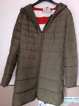 Chaqueta con relleno de plumas en color verde oliva. Costó 60 euros y está en muy buen estado ya que se ha usado poco. Unisex. Es talla 4-6 años pero dá más talla. En la última foto pongo la medida de largo desde el cuello hasta el bajo son 41 centímetros.