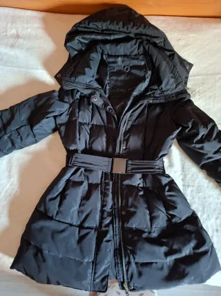 Abrigo de plumas acolchado negro. - Bolsillos laterales - Diseño con capucha. ( extraible ) - Cierre de cremallera y corchetes - Cinturón elastico con hebilla metálica. - Entallado en cintura. - Abrigo de plumas que ya no hacen. - Talla pequeño