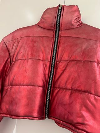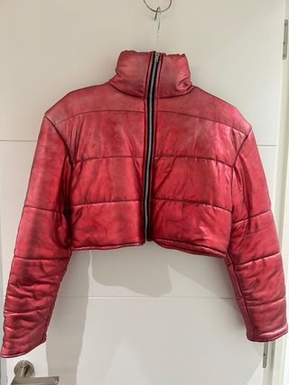 Plumífero corto con un acabado brillante y llamativo. - Diseño acolchado. - Cuello alto. - Cremallera frontal. Usado 2 veces pero el color se esta un poco desgastando aunque si pega con el resto