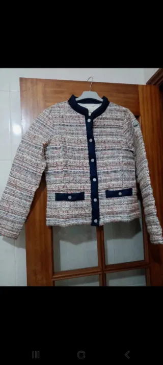 PRIMERA IMAGEN IA PARA VER COMO QUEDA Perfecto estado, un color d fondo como un beige claro en la última imagen señalada con flecha blanca se muestra el tono real pues cambia por el flash en las otras fotos Super ligero, embolsillado delantero y ribeteado en azul marino Ver tallaje en etiquetas en foto Talla S Con plumón en la composición Incluyo fotos derecho y revés de la prenda